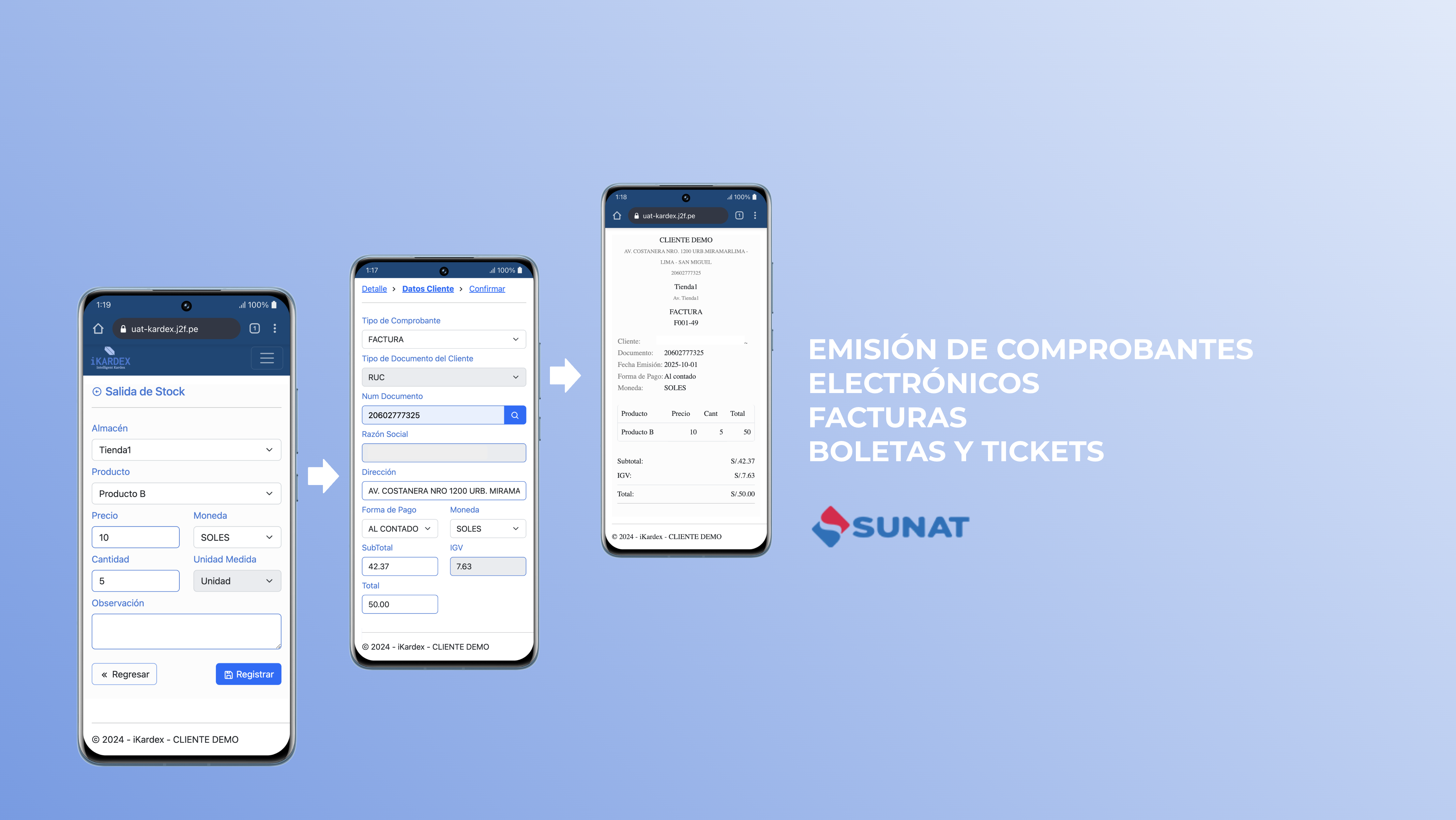 Todos sus comprobantes electrónicos (Facturas y Boletas de ventas) serán transmitidos a SUNAT de una manera segura, rápida y automática.